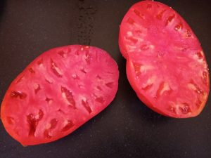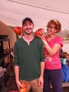 Tomatoes, tomatoes, tomatoes; so far we have harvested 2,666 pounds of this flavor of summer. As we pick and save some of the prize winners for seed saving, Laura decides to see if they are as big as Andrew’s head!