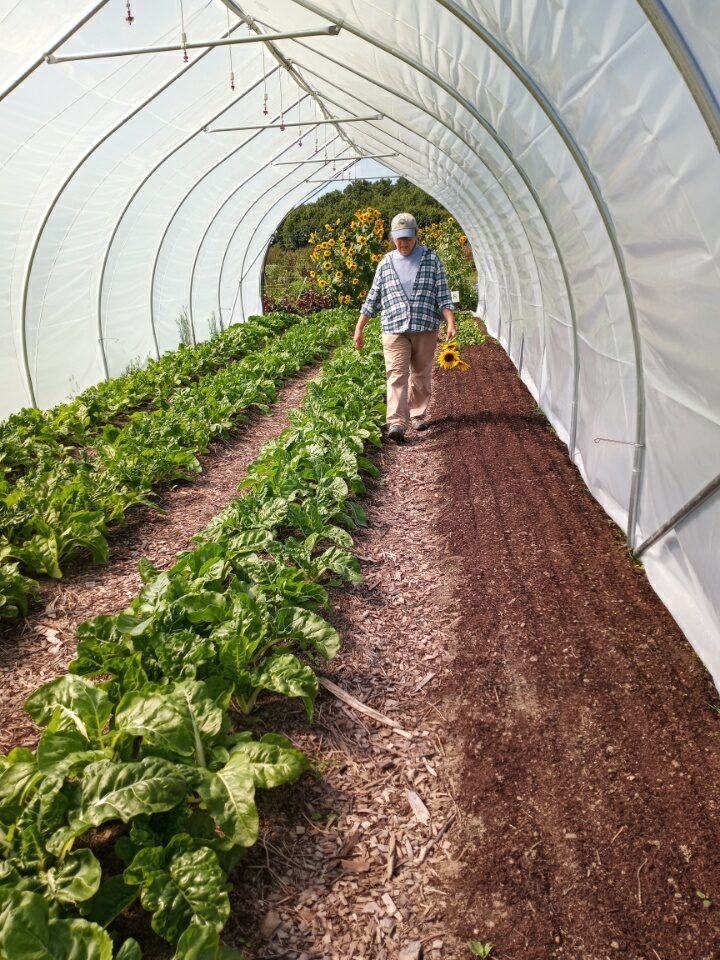 We are also still planting and nurturing cool weather crops for fall harvest. Part of our mission is to extend the season with our new tunnels and under row covers. Cathy is admiring a tunnel full of Swiss chard and Japanese salad turnips. This coming week we will be planting more lettuce and spinach. Our fall cabbage crop is extraordinary, but I don’t want to talk about the Fall Broccoli. 🙁