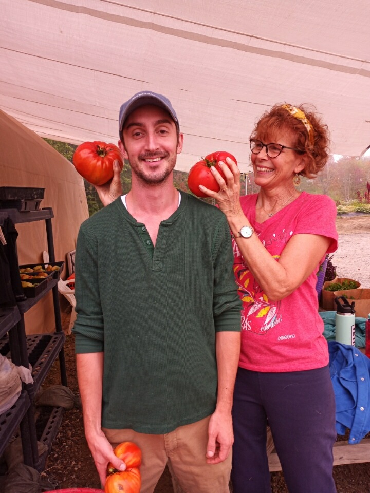 Tomatoes, tomatoes, tomatoes; so far we have harvested 2,666 pounds of this flavor of summer. As we pick and save some of the prize winners for seed saving, Laura decides to see if they are as big as Andrew’s head!