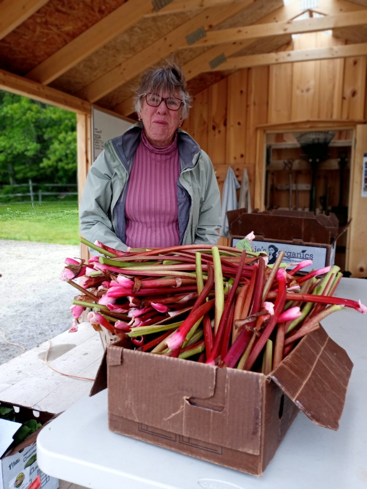 On Friday, Carolyn, one of the gleaning leaders for MCHPP, went up to harvest rhubarb in left field. We feed this rhubarb every Fall with goat manure from Edison, Einstein, and the rest of the goat family. It has become a big bountiful crop. Carolyn, on her first encounter with the rhubarb this season, came back with a big WOW on her face and a grand idea. She commented that we have a “Pick a Bouquet for a Donation” garden, why not pick a peck of rhubarb for a donation?! So I am putting it out there–COME AND HARVEST AS MUCH RHUBARB AS YOU COULD USE AND LEAVE G2G A DONATION. We are open Monday through Saturday 8-2.