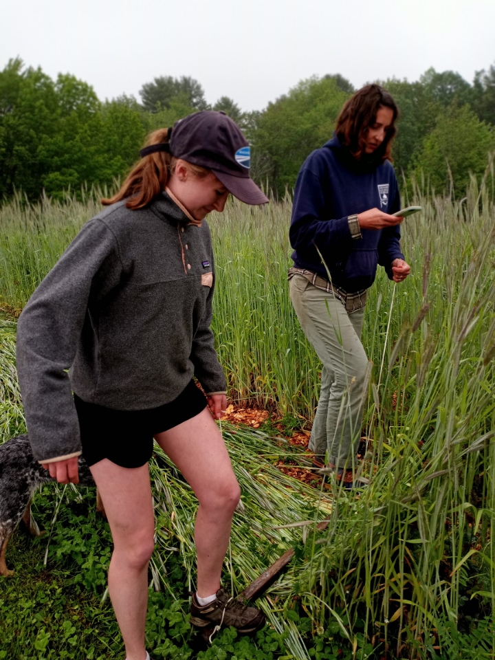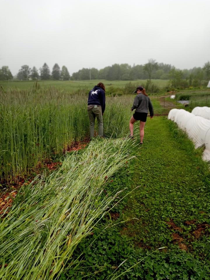 This was the week to crimp all the winter rye. Carrie and Claire created their own system of a board with rope stirrups and took it all down remarkably fast. It was like watching synchronized farming! Carrie became so adept she was able to multitask while crimping–checking her phone. 🙂